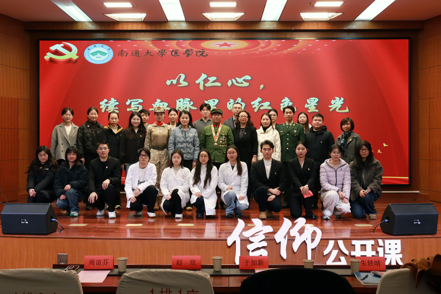 活动中,于加新老英雄以《铁血铸军魂,初心践使命》为题,用亲身经历讲述烽火岁月中的忠诚与担当,将那段波澜壮阔的历史化作饱含热血的思政教材,令在场师生深受震撼。随后,学院党委委员、教工第五党支部书记朱轶晴以《通医人的抗战峥嵘记忆》为题,回溯校史,将通医先辈在抗战烽火中坚守的医者初心娓娓道来;本科第一党支部学生党员代表万欣仪以《我的两场青春远征:迷彩绿与天使白》,用“军装+白大褂”的青春选择,诠释了当代通医学子的爱国情怀。